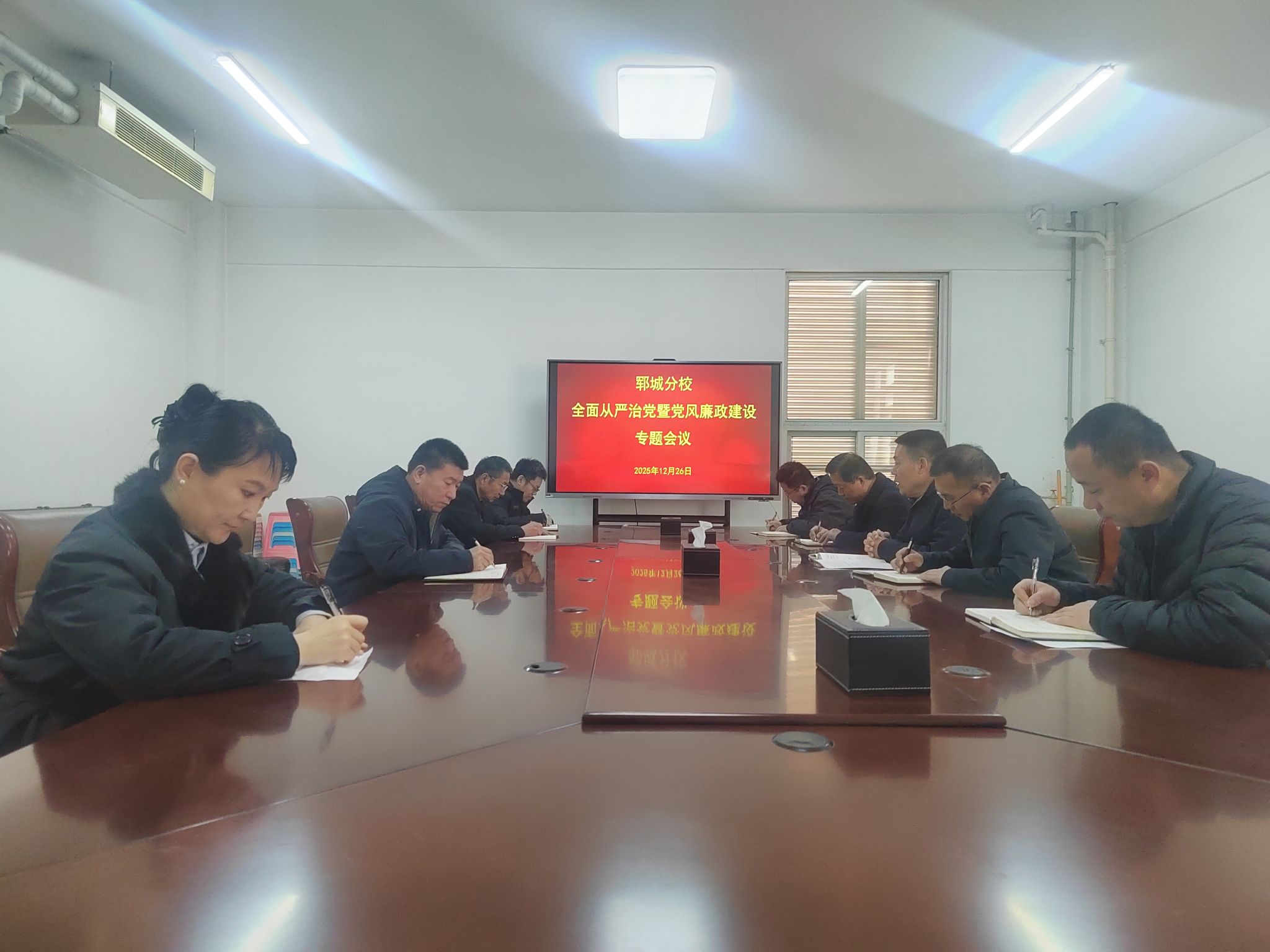 为深入学习贯彻习近平新时代中国特色社会主义思想,全面落实党的二十届四中全会精神,持续以严的基调、严的措施、严的氛围推进全面从严治党向纵深发展,不断开创党风廉政建设工作新局面,12月26日,郓城分校召开2025年全面从严治党暨党风廉政建设专题会议。分校党委班子成员、部门负责人及党支部书记参会。会议由分校党委书记许腾主持。