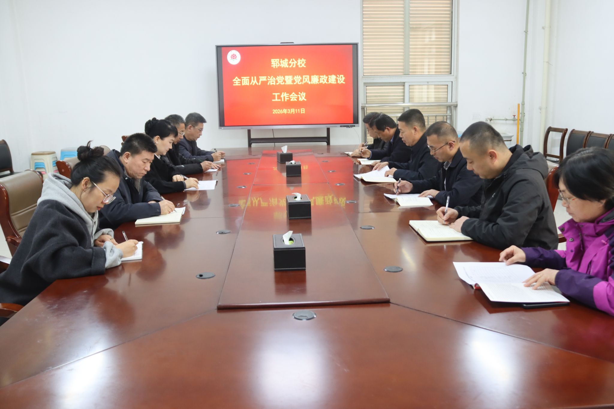 3月11日下午,郓城分校召开2026年全面从严治党暨党风廉政建设工作会议。会议深入贯彻落实党的二十大及二十届四中全会精神,传达学习山东省纪委十二届五次全会及学校相关会议精神,全面总结2025年工作成效,系统部署2026年重点任务。分校党委委员、科室负责人、党支部书记参加会议,分校党委书记许腾主持会议。